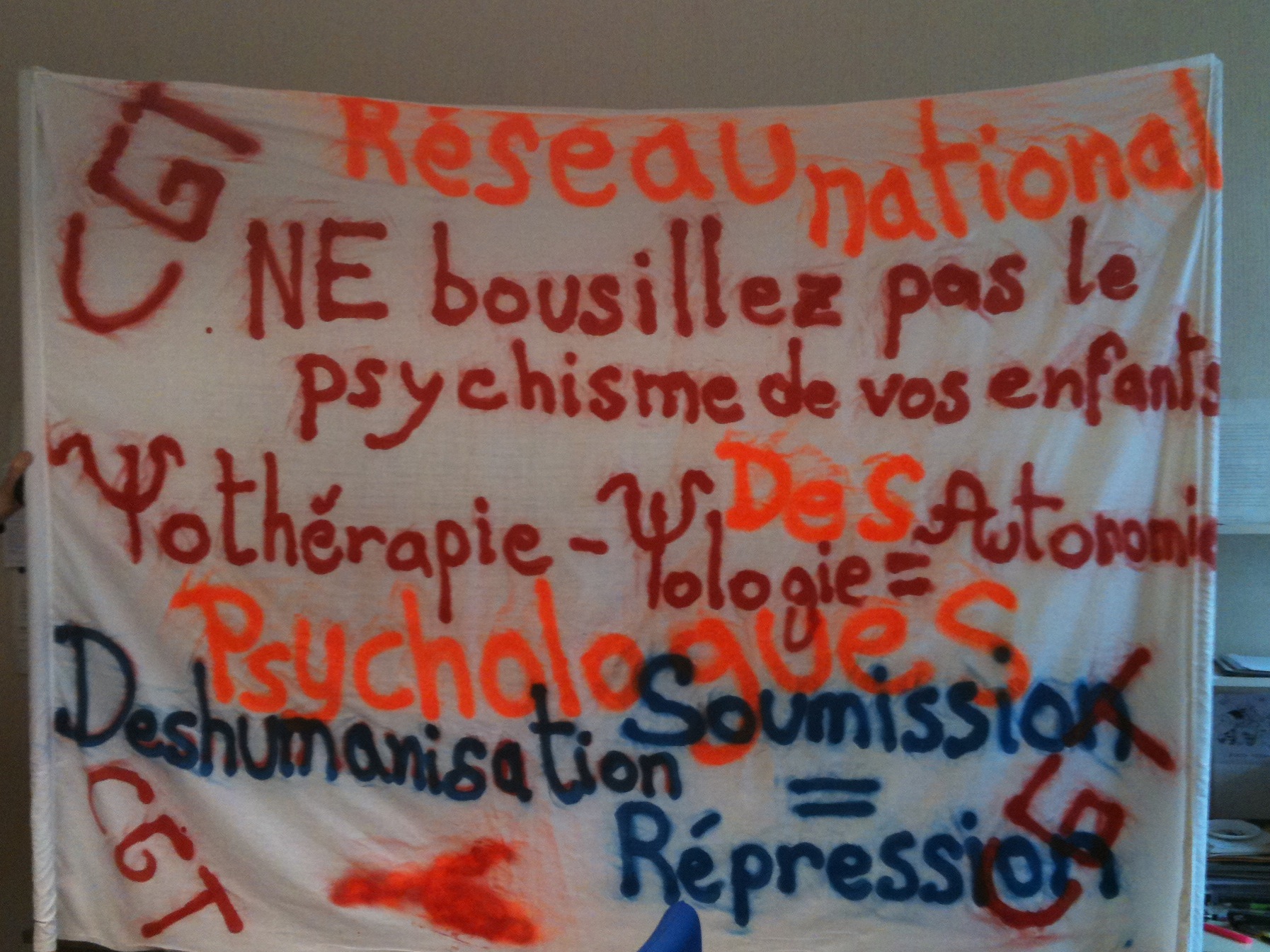 Contre les conditions de travail inadmissibles, contre le démantèlement de la profession, pour que nos citoyens puissent librement choisir leur psychologue, que nous puissions leur consacrer du temps de la parole nécessaire, pour faire reconnaître et empêcher la négation du rôle du psychisme pour tout humain, pour que nous puissions accomplir notre mission première, quel que soit le champ d'exercice, qui est celle d'oeuvrer à l'autonomie de la personne.